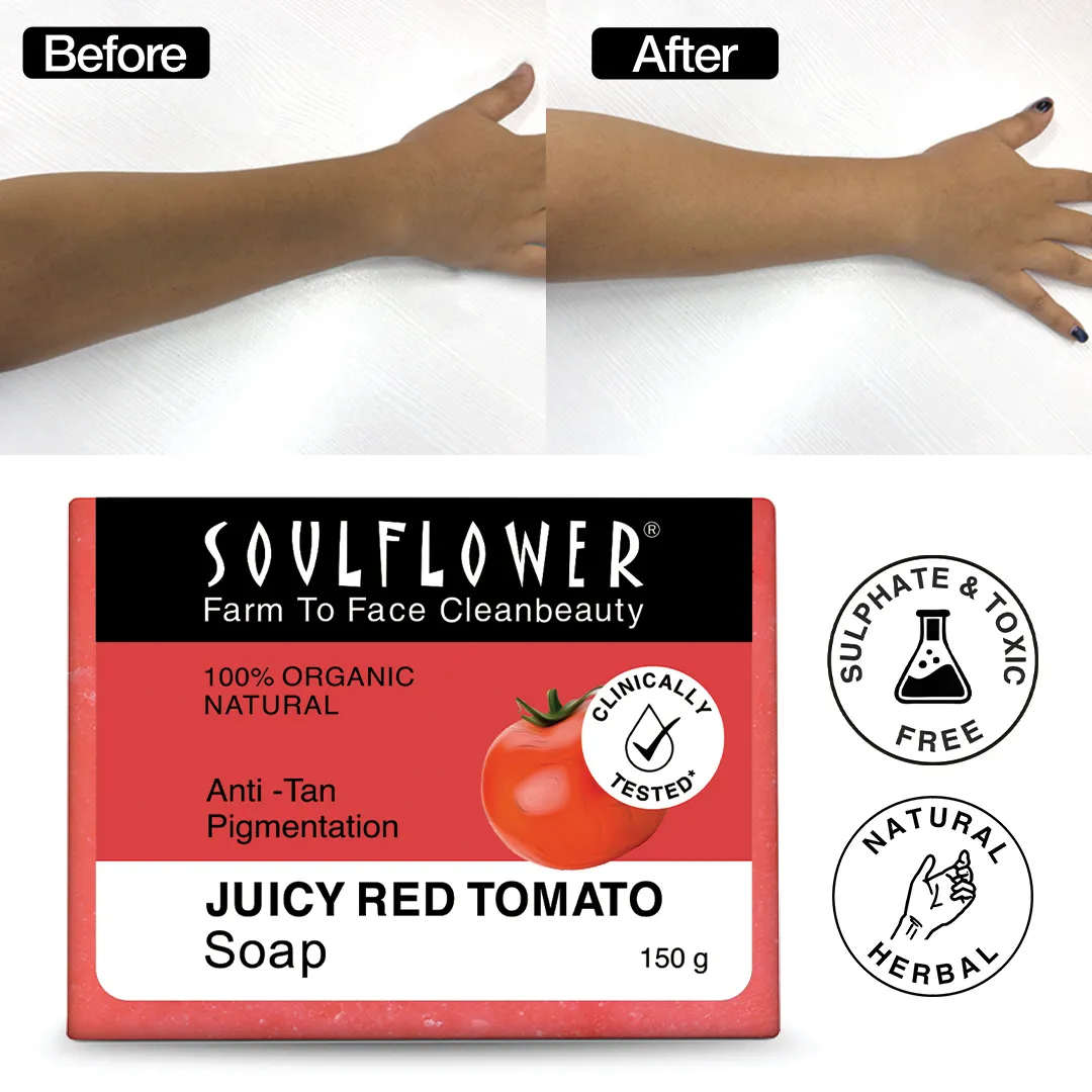 - Introducing our multitasking, all-season soap: Juicy Red Tomato Soap! Packed with fresh tomatoes, beetroots grown on our own farms. It's a cold-processed soap technique with olive oil & castor oil for lasting moisture. The soap reduces redness, provides natural collagen & hydration. It further reduces tan lines, fades pigmentation, & reveal brighter, younger skin.